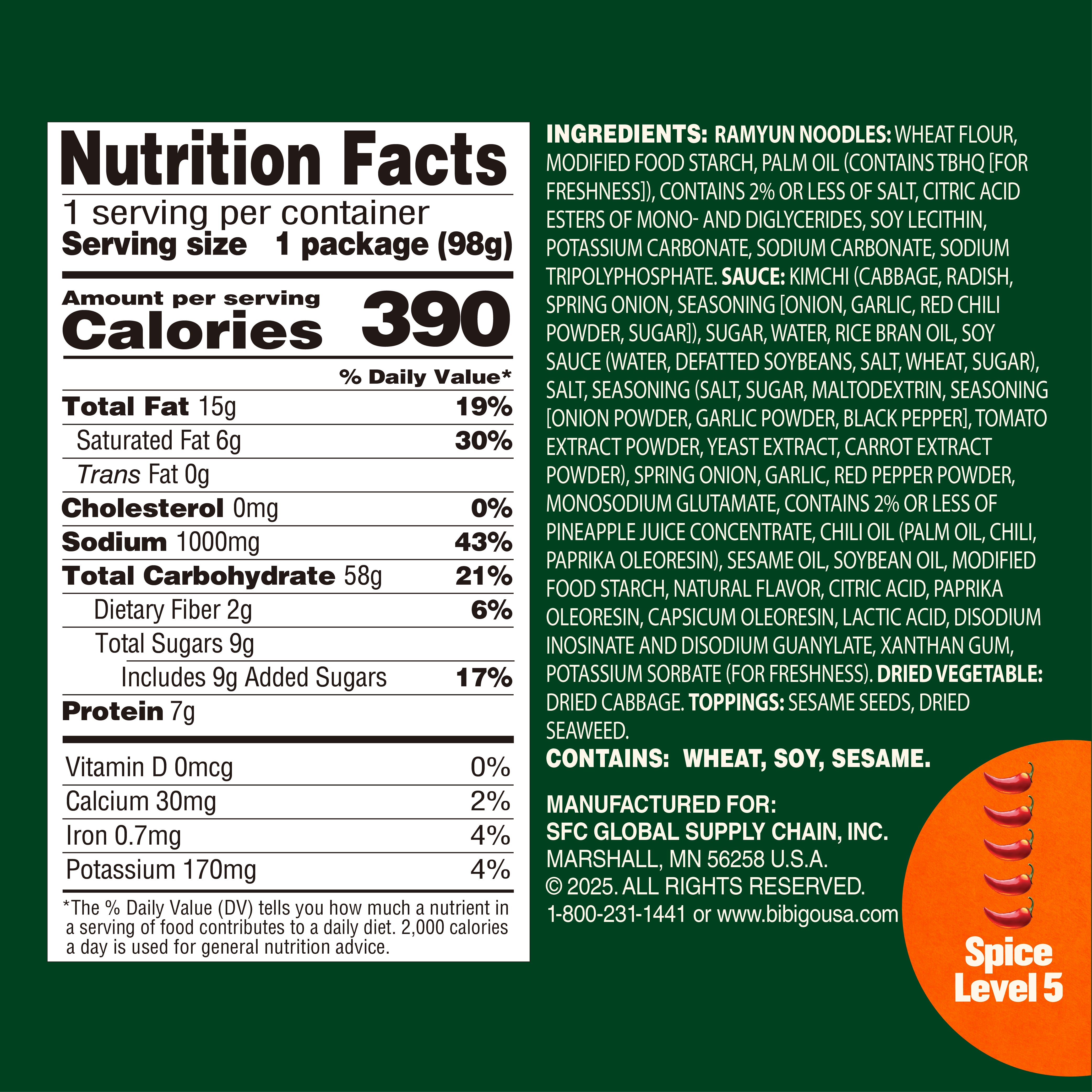 RAMYUN NOODLES: WHEAT FLOUR, MODIFIED FOOD STARCH, PALM OIL (CONTAINS TBHQ [FOR FRESHNESS]), CONTAINS 2% OR LESS OF SALT, CITRIC ACID ESTERS OF MONO- AND DIGLYCERIDES, SOY LECITHIN, POTASSIUM CARBONATE, SODIUM CARBONATE, SODIUM TRIPOLYPHOSPHATE. SAUCE: KIMCHI (CABBAGE, RADISH, SPRING ONION, SEASONING [ONION, GARLIC, RED CHILI POWDER, SUGAR]), SUGAR, WATER, RICE BRAN OIL, SOY SAUCE (WATER, DEFATTED SOYBEANS, SALT, WHEAT, SUGAR), SALT, SEASONING (SALT, SUGAR, MALTODEXTRIN, SEASONING [ONION POWDER, GARLIC POWDER, BLACK PEPPER], TOMATO EXTRACT POWDER, YEAST EXTRACT, CARROT EXTRACT POWDER), SPRING ONION, GARLIC, RED PEPPER POWDER, MONOSODIUM GLUTAMATE, CONTAINS 2% OR LESS OF PINEAPPLE JUICE CONCENTRATE, CHILI OIL (PALM OIL, CHILI, PAPRIKA OLEORESIN), SESAME OIL, SOYBEAN OIL, MODIFIED FOOD STARCH, NATURAL FLAVOR, CITRIC ACID, PAPRIKA OLEORESIN, CAPSICUM OLEORESIN, LACTIC ACID, DISODIUM INOSINATE AND DISODIUM GUANYLATE, XANTHAN GUM, POTASSIUM SORBATE (FOR FRESHNESS). DRIED VEGETABLE: DRIED CABBAGE. TOPPINGS: SESAME SEEDS, DRIED SEAWEED.