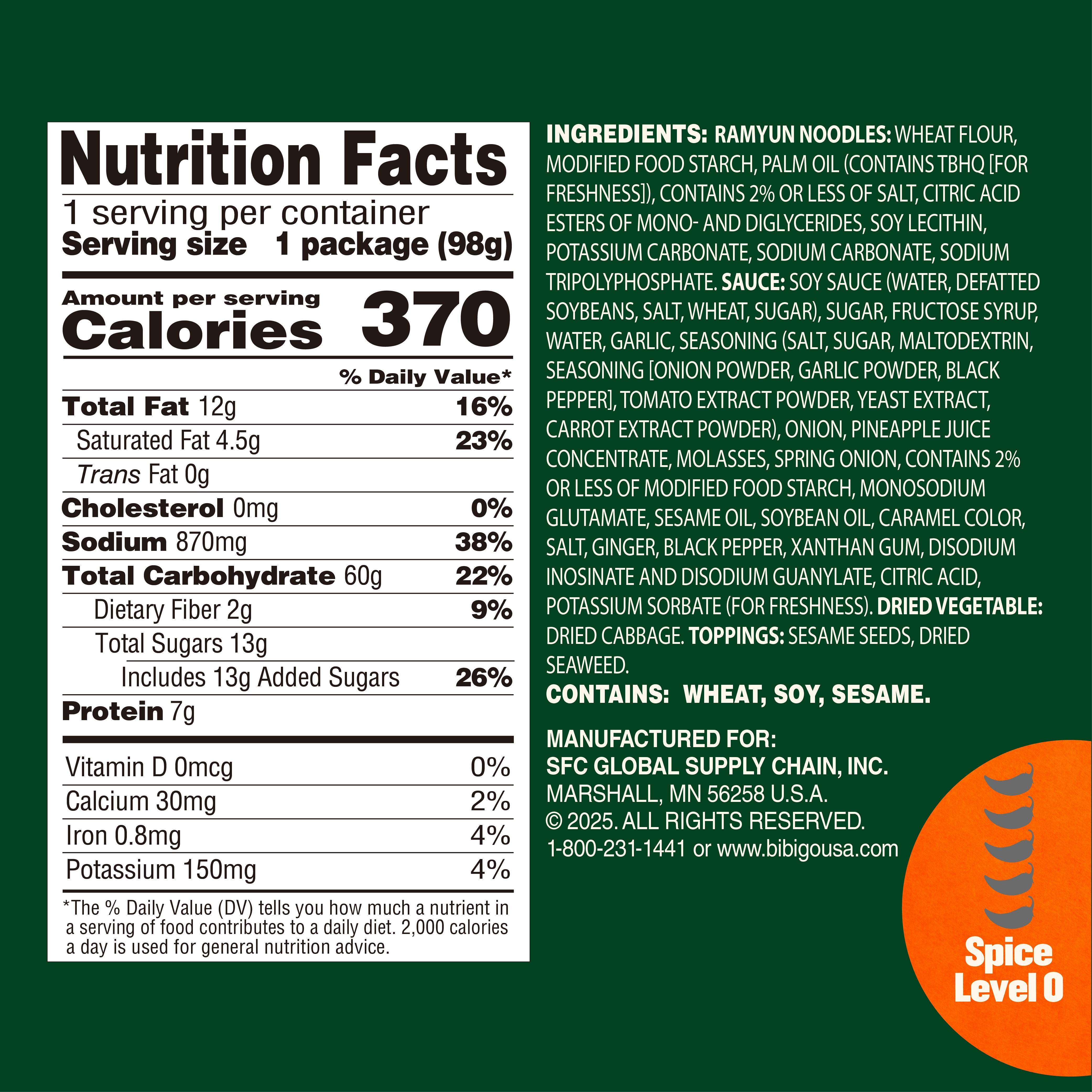 RAMYUN NOODLES: WHEAT FLOUR, MODIFIED FOOD STARCH, PALM OIL (CONTAINS TBHQ [FOR FRESHNESS]), CONTAINS 2% OR LESS OF SALT, CITRIC ACID ESTERS OF MONO- AND DIGLYCERIDES, SOY LECITHIN, POTASSIUM CARBONATE, SODIUM CARBONATE, SODIUM TRIPOLYPHOSPHATE. SAUCE: SOY SAUCE (WATER, DEFATTED SOYBEANS, SALT, WHEAT, SUGAR), SUGAR, FRUCTOSE SYRUP, WATER, GARLIC, SEASONING (SALT, SUGAR, MALTODEXTRIN, SEASONING [ONION POWDER, GARLIC POWDER, BLACK PEPPER], TOMATO EXTRACT POWDER, YEAST EXTRACT, CARROT EXTRACT POWDER), ONION, PINEAPPLE JUICE CONCENTRATE, MOLASSES, SPRING ONION, CONTAINS 2% OR LESS OF MODIFIED FOOD STARCH, MONOSODIUM GLUTAMATE, SESAME OIL, SOYBEAN OIL, CARAMEL COLOR, SALT, GINGER, BLACK PEPPER, XANTHAN GUM, DISODIUM INOSINATE AND DISODIUM GUANYLATE, CITRIC ACID, POTASSIUM SORBATE (FOR FRESHNESS). DRIED VEGETABLE: DRIED CABBAGE. TOPPINGS: SESAME SEEDS, DRIED SEAWEED.